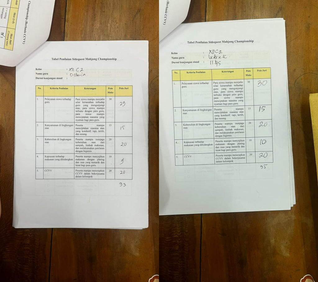 - Bu Octavia memberikan total nilai sebesar 93 di mana nilai tersebut diperoleh dari 29 poin dari pelayanan siswa terhadap guru, 15 poin dari kenyamanan di lingkungan stan, 20 poin dari kebersihan di lingkungan stan, 9 poin dari kepuasan terhadap makanan yang dihidangkan, dan 20 poin dari CCVV. Hal ini berarti menurut Bu Octavia, pelayanan siswa terhadap guru sangat baik, kenyamanan lingkungan stan sangat baik, kebersihan di lingkungan stan sangat baik, kepuasan terhadap makanan yang dihidangkan sangat baik, dan penerapan CCVV sangat baik.