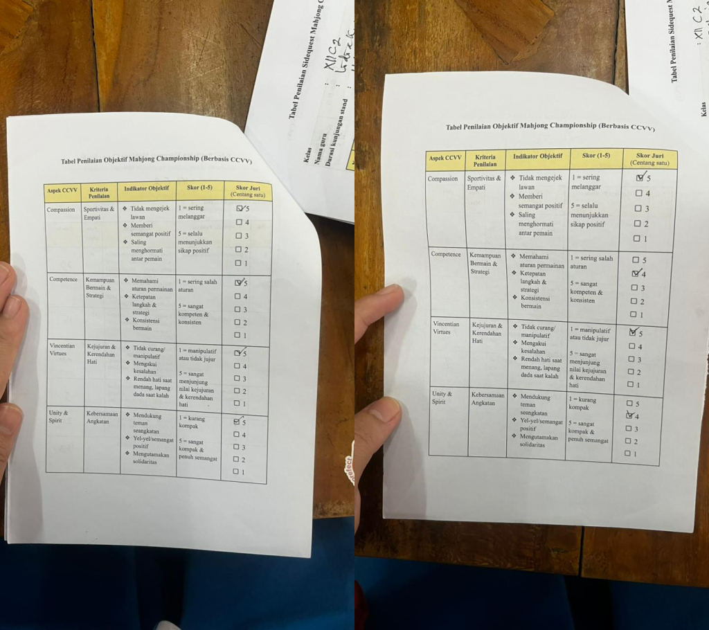 - Bu Lidia memberikan nilai 5 untuk Compassion, Competence, Vincentian Virtues, dan Virtues & Spirit. Hal ini berarti menurut Bu Lidia, para pemain mahjong secara keseluruhan menunjukkan sportivitas, kemampuan strategi, kejujuran, dan semangat kebersamaan yang sangat baik.